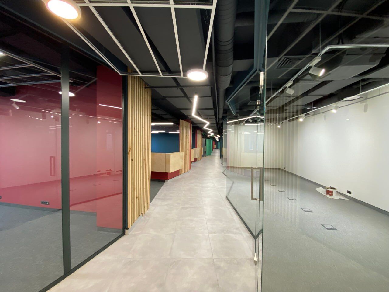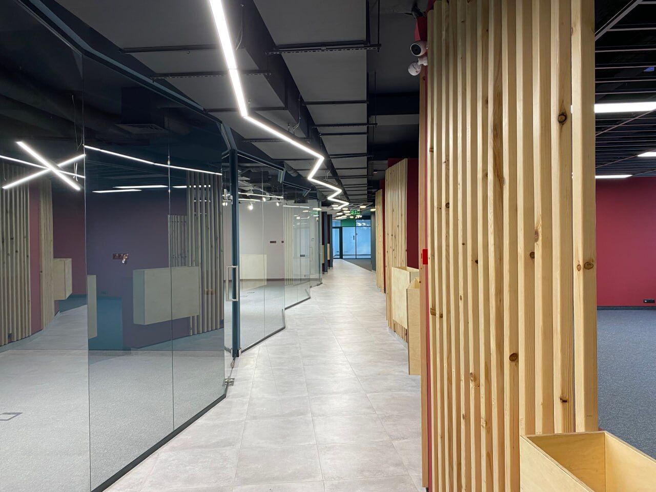 Все просто – стекло, дерево, металл и немного фантазии, ну и конечно опыта. Центральный коридор выполнен как зигзаг (система UALCOM-Crystal), а свет как молния режущее небо. От заказчика была поставлена задача максимально минимизировать бюджет. Что и было исполнено. Генподрядчик выполняла ремонт компания "Строй Сити", заботилась об этом, а UALCOM дополнила проект стеклом с интересными решениями за небольшие деньги. Входная группа исполнена в системе UALCOM-Standart.