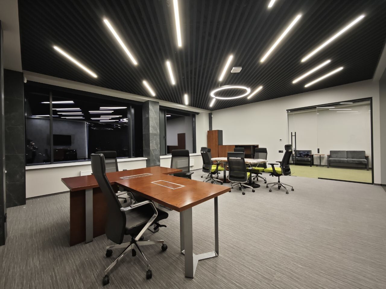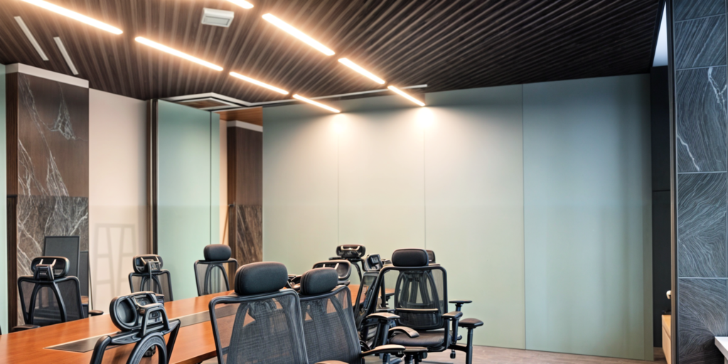 Также в этом проекте использована система трансформированных акустических стен UALCOM-HUFCOR, позволяющая делить большой конференц-зал на два меньших зала, данный продукт имеет высокие показатели звукоизоляции, что позволяет проводить несколько встреч в разделенном помещении одновременно.