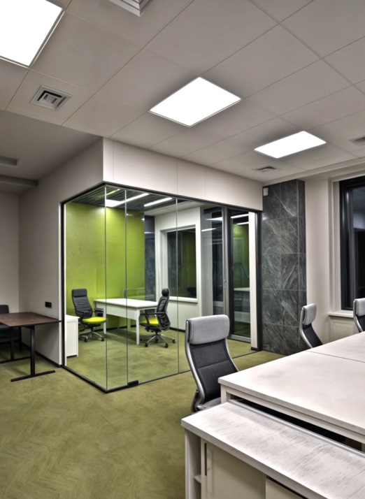 Новый офис занимает два этажа офисного центра, в ремонте были использованы цельностеклянные офисные перегородки UALCOM-Crystlal, которые эффективно делят пространство, сохраняя максимальную открытость помещений.