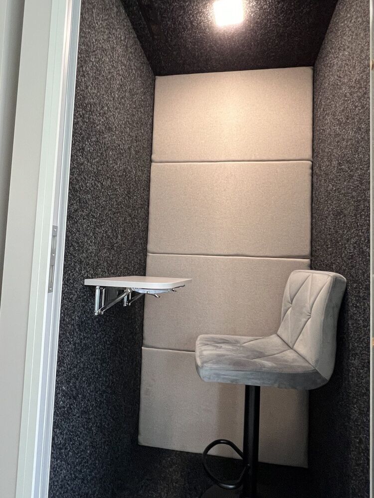 В базовій комплектації кабіна дає достатній рівень звукоізоляції – до 35 ДБ, що надає змогу комфортно проводити телефонні розмови та зустрічі в сучасному шумному офісі, кабіна має притяжну вентиляцію, що дозволяє тривалий час знаходитись всередині з комфортом, кабіна має Led-світло, викідний столік, розетки для телефонів та гаджетів. Є можливість встановити декілька варіантів дверей, різне скло, фурнітуру, виготовити кабіни більшого за базові розміру, тощо…