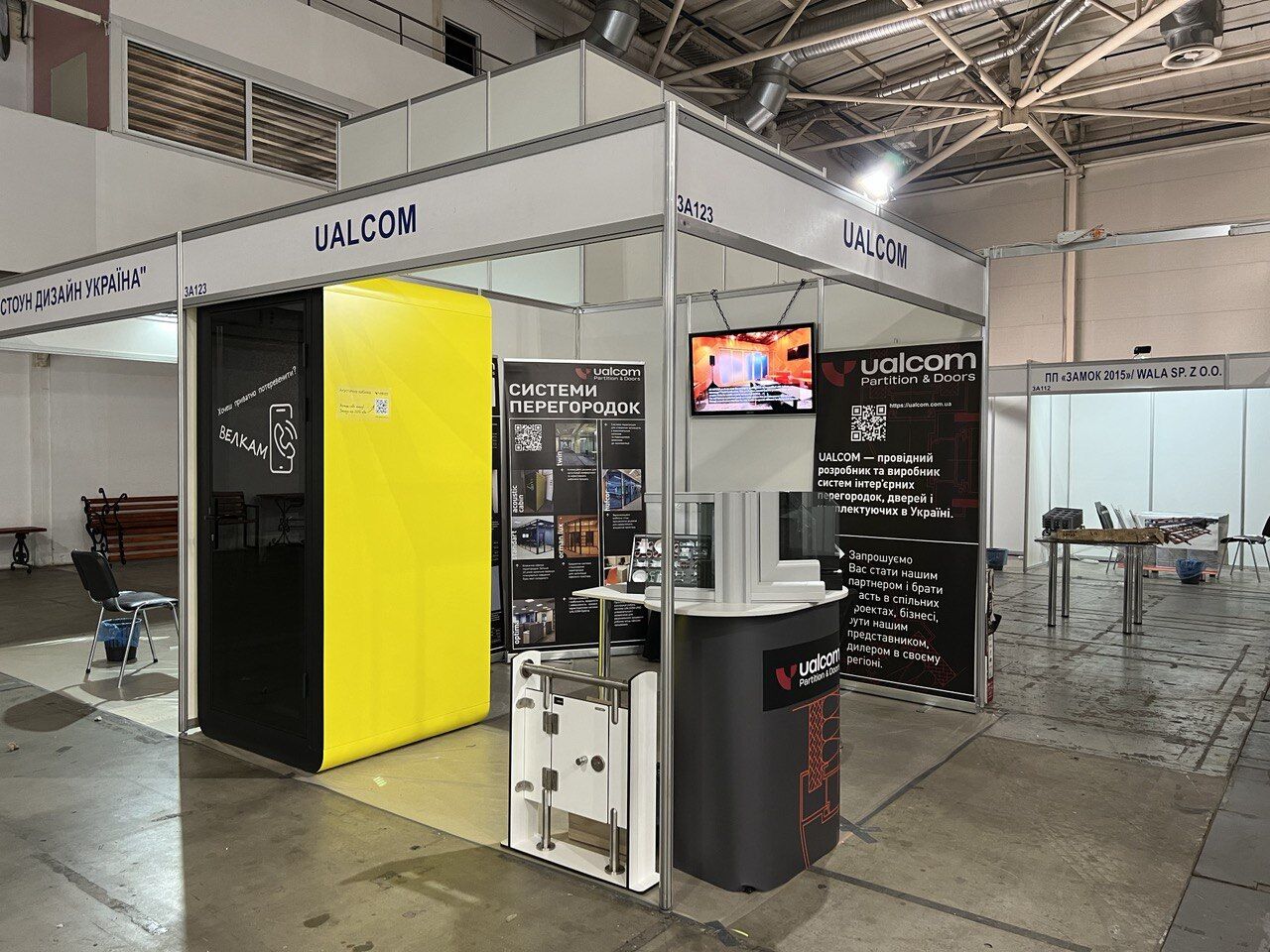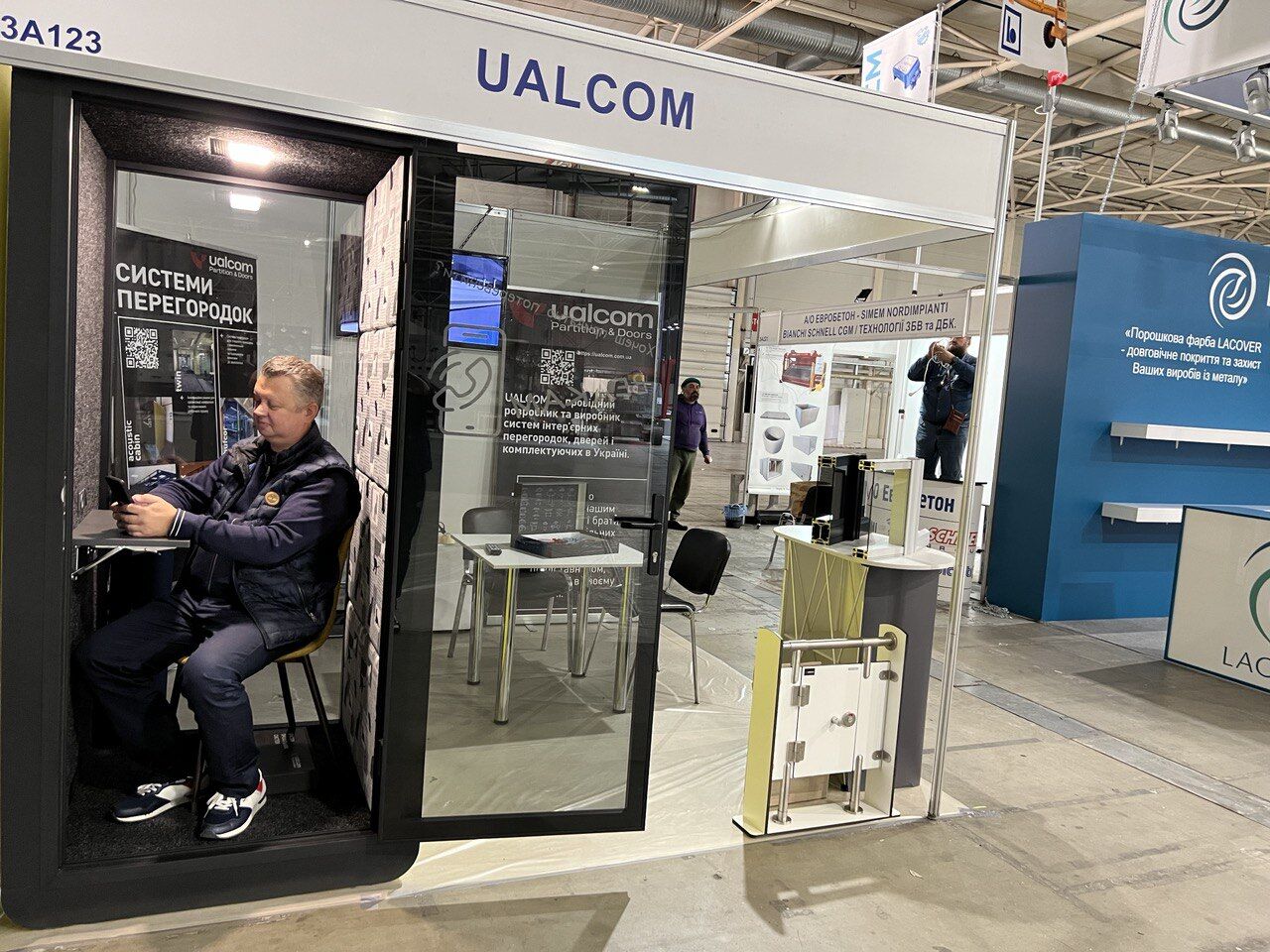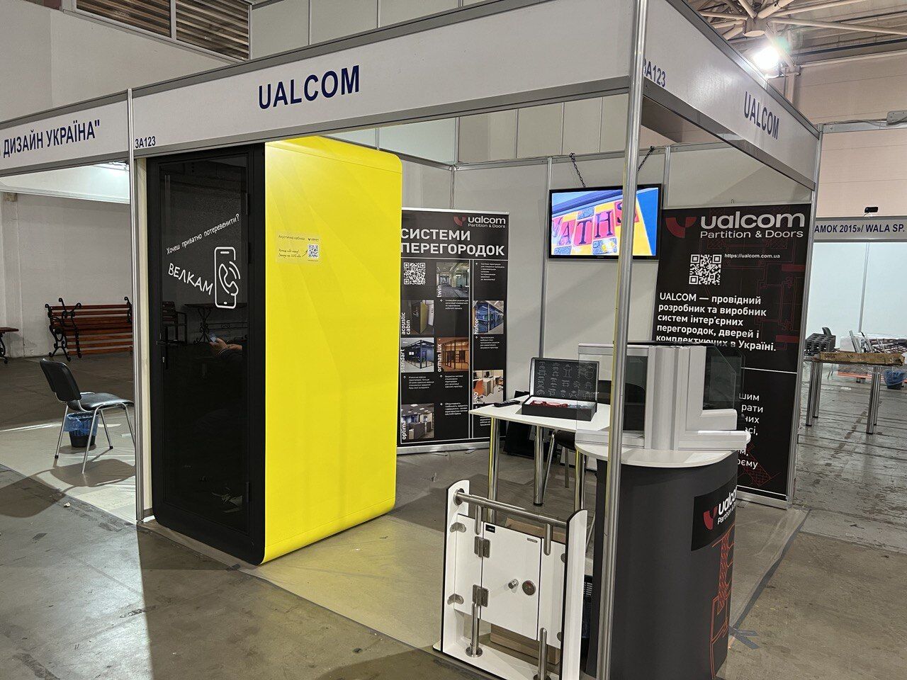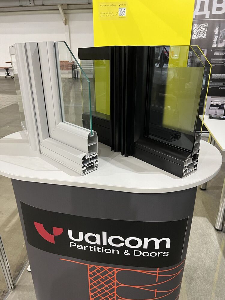 У відвідувачів викликали велику зацікавленість останні розробки від UALCOM: найсучасніший тренд в облаштуванні офісів - акустичні кабінки, двері Stels Glass, нові алюмінієві профілі системи Standart.