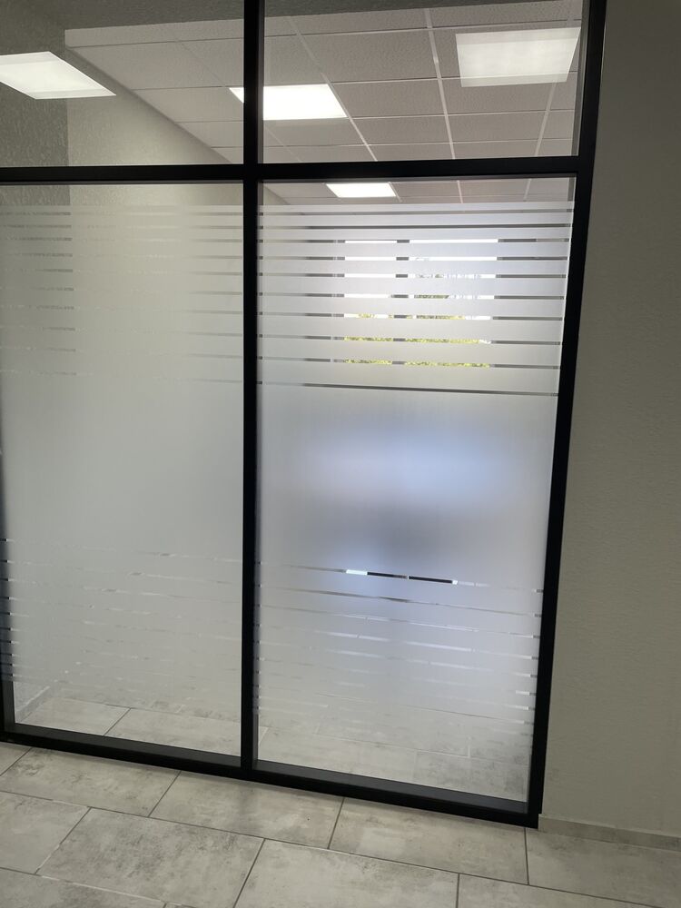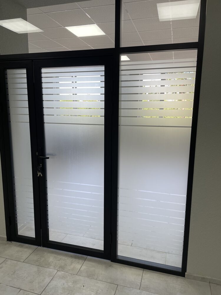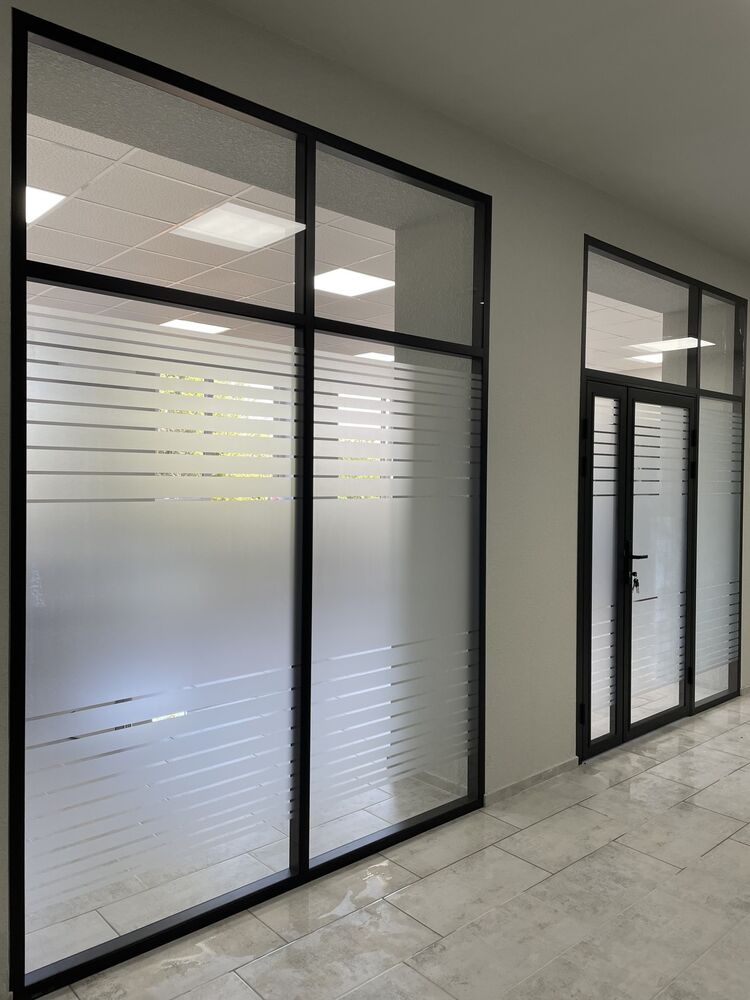 - Для сохранения светопроницаемости, но вместе с тем отделения рабочего процесса от внешней жизнедеятельности офиса, перегородки были декорированы матовой пленкой.